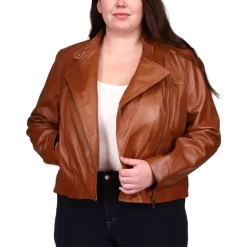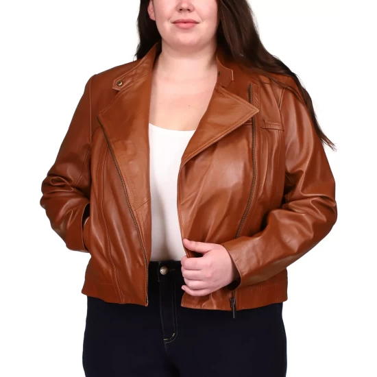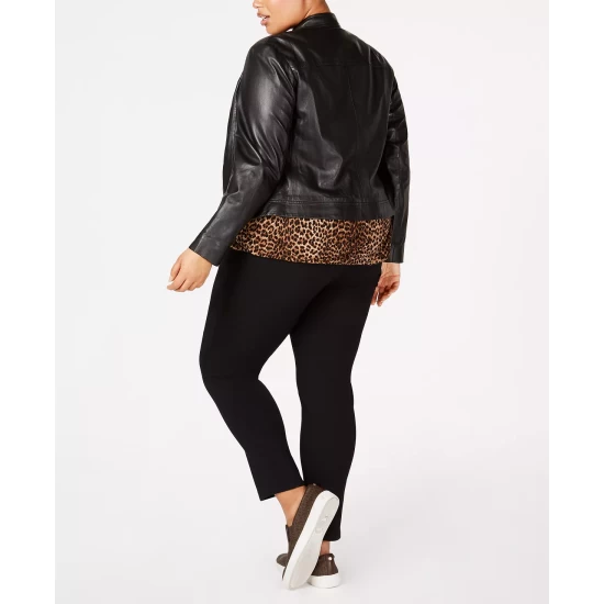 Genuine leather gives this plus size moto jacket from MICHAEL Michael Kors a luxe look. A snap-closure band collar keeps this piece feeling sleek and streamlined.