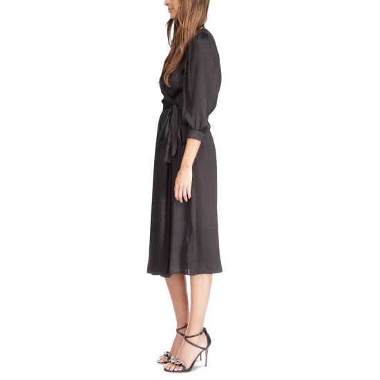 - Surplice neckline; Midi silhouette