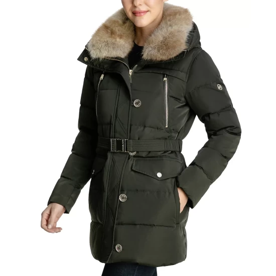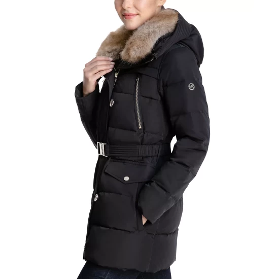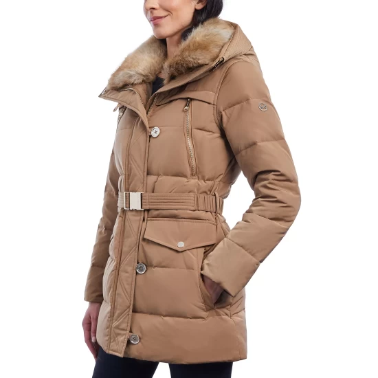 A chic faux-fur collar lends a little glam to this belted down puffer coat from MICHAEL Michael Kors.