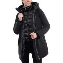 - Attached drawstring hood & fixed bib; front zipper closure with faux-leather trim