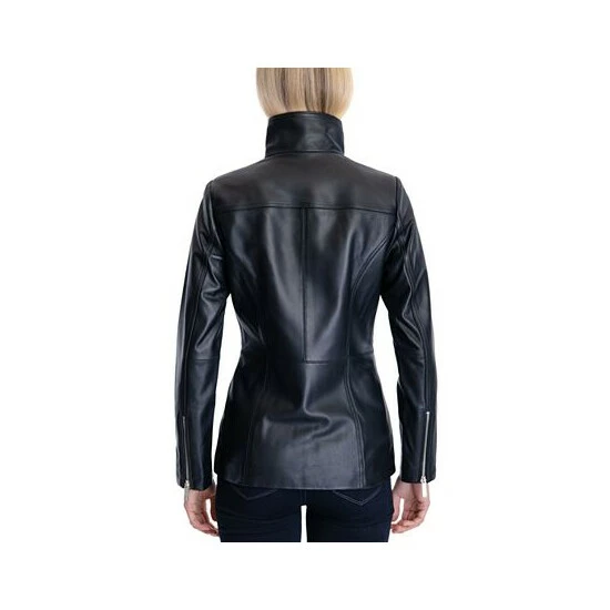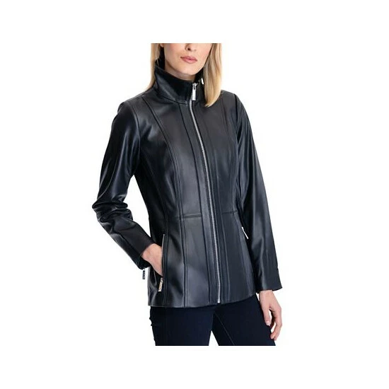 A sleek funnel collar tops off this stunning leather coat from MICHAEL Michael Kors, designed with two zip pockets and a full zip front.