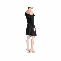- Sleeveless with a chain strap at right, long sleeve with ruffle at left