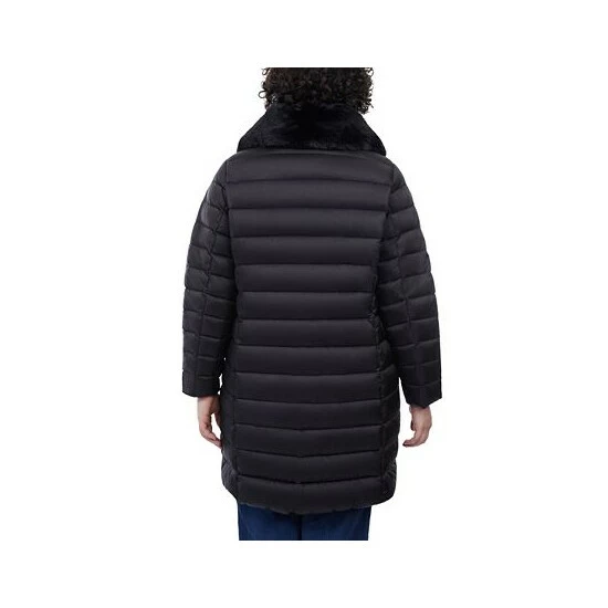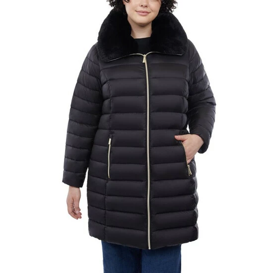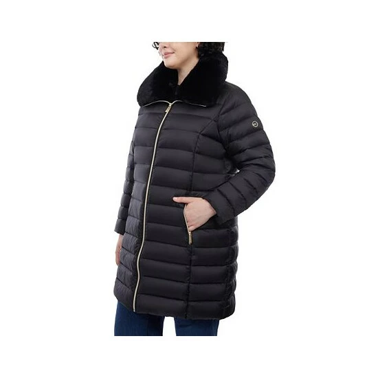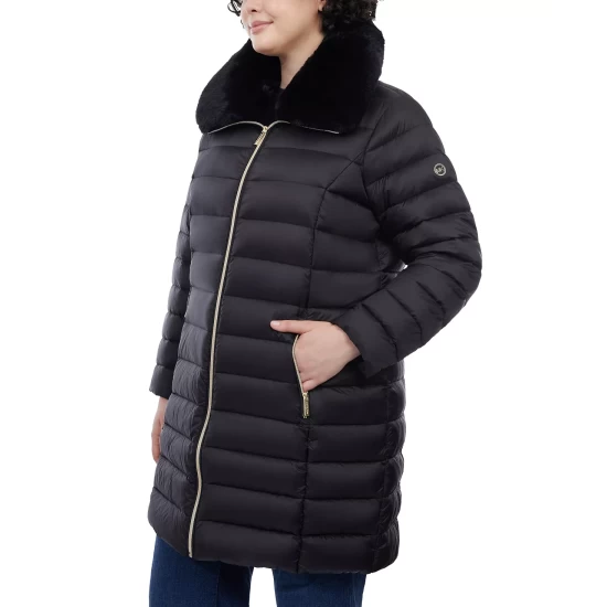 A removable faux-fur collar lends a little glam to this plus size down puffer coat from MICHAEL Michael Kors.