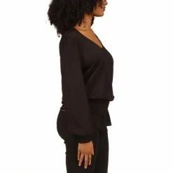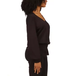 Flowy sleeves and a blousy bodice are cinched with smocking to shape up the jersey-knit style of this V-neck top from MICHAEL Michael Kors.