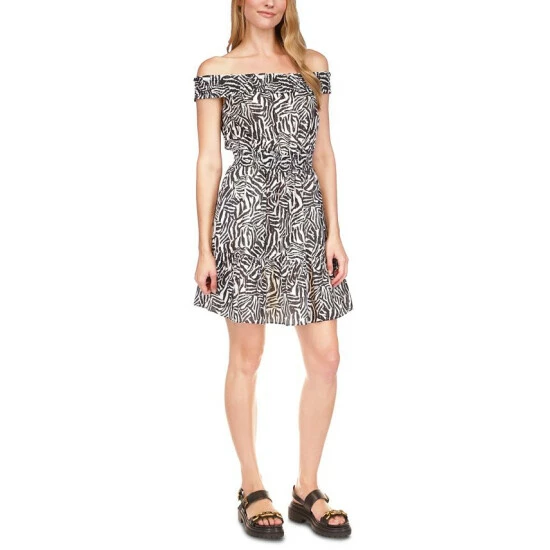 Playful sophistication. This woven off-the-shoulder dress from MICHAEL Michael Kors adds metallic highlights to a trendy zebra print.
